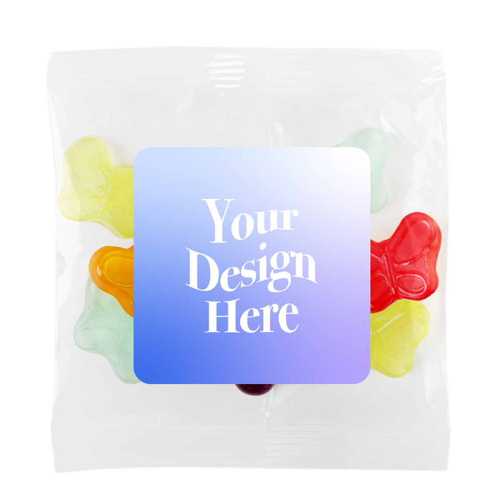 Add a colorful touch to your giveaways with custom butterfly gummy snack pack