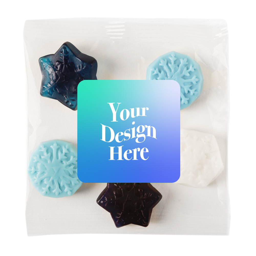 Add festive flavor with a custom snowflake gummy snack pack